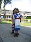 到了會場地點,因為我們都不知道取票的確切地點在哪裡,所以下了公車後就朝戶外舞臺走去。沒想到還沒走到,堂妹就被一群cosplayers給認了出來,原來是她的朋友。雖然說明天才開始,今天只是取票而已,還是看到了不少的cosplayers,大部分是Naruto和Bleach,不過也看到了意外的角色:うたわれるもの的エルルゥ和アルルゥ。我很想立刻照張相片,不過她們和其他的cosplayers正在跳ハレ晴レユカイ。等她們跳完了就給她們拍了張照片: